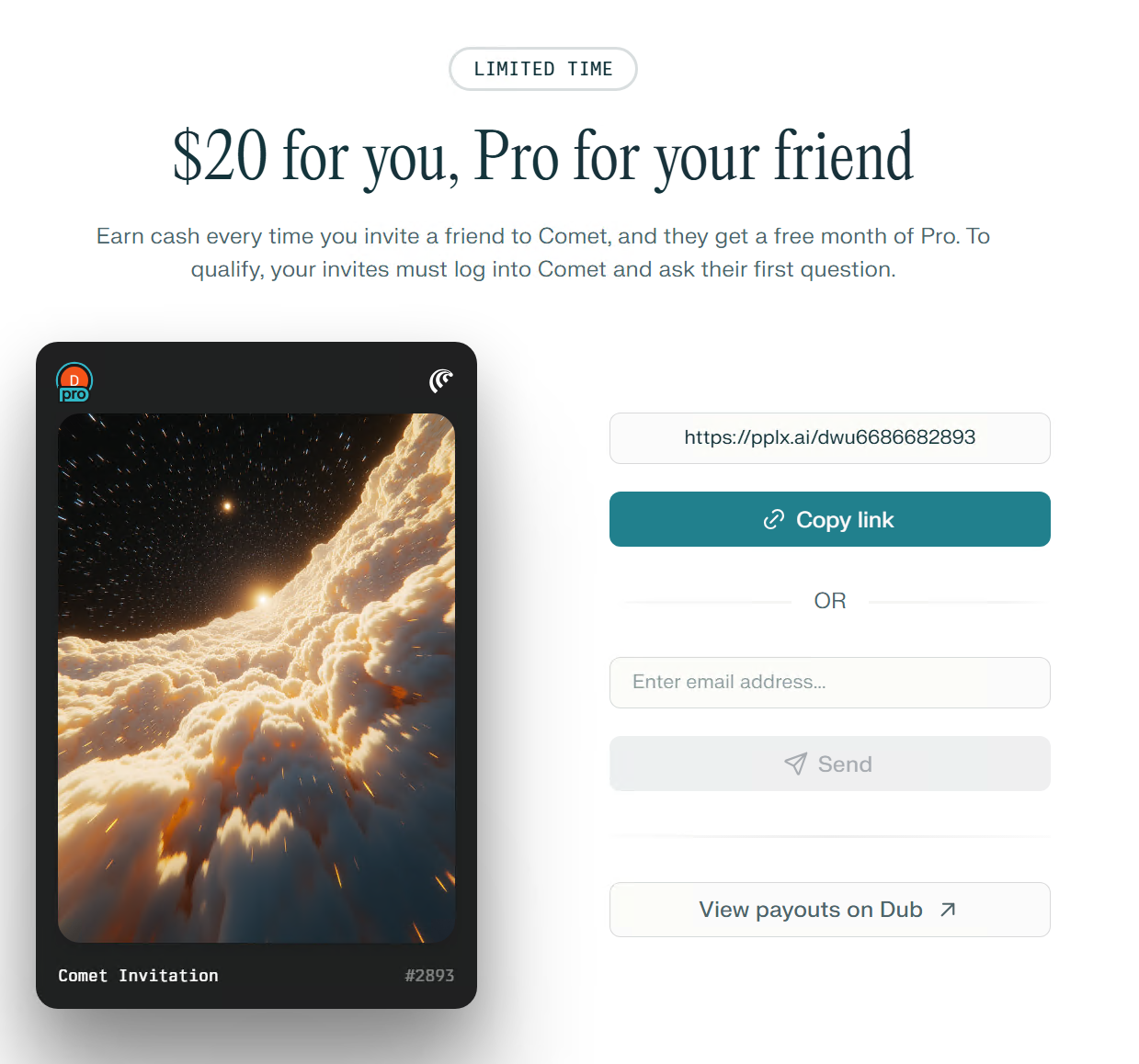 “AI browser wars = free money! Invite a friend to try Comet (by Perplexity) and earn up to $20. Download, ask one AI question, and get paid: [Your Link]”